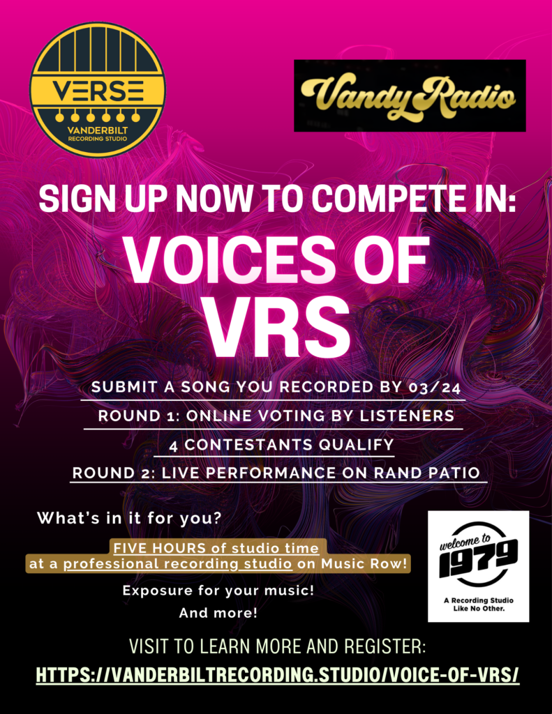 - Round 2 will be hosted during Vandy Radio’s Live Show on the Rand Patio on April 7th, 2026. The four (4) contestants who qualified will perform their submitted song live. Live voting results will determine the winner and Voice of VRS!